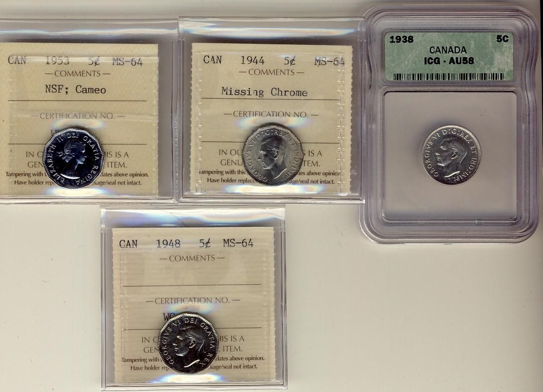 1938 5¢ ICG AU58 & 1953 NSF 5¢ ICCS MS64 Cameo along with 1944 Missing Chrome & 1948 5¢ ICCS MS64. Lot of 4 certified coins.