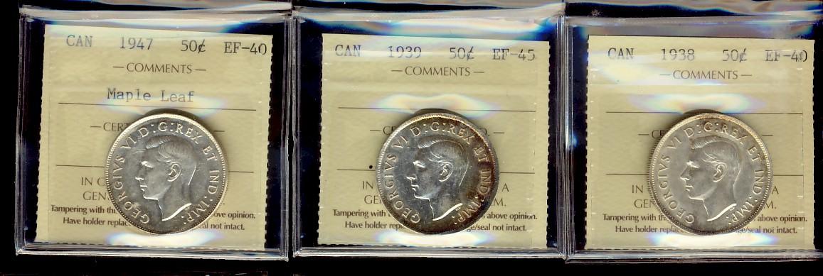 1938 50¢, 1939 & 1947 ML ICCS EF40. Lot of 3 coins.