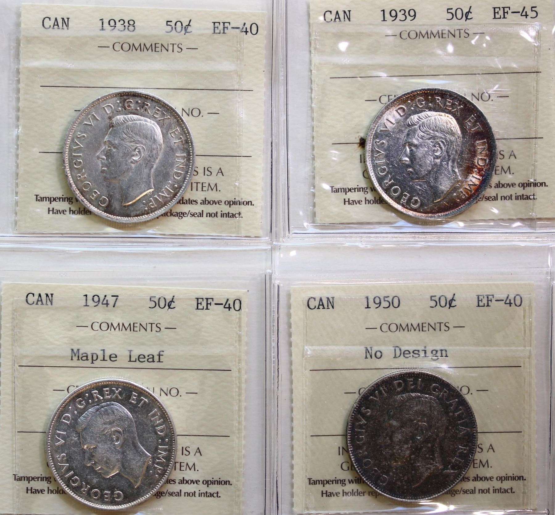 1938 50¢, 1939, 1947 "Maple Leaf", 1950 "No Design". Lot of 4 coins ICCS Extra Fine-40 to Choice Extra Fine-45
