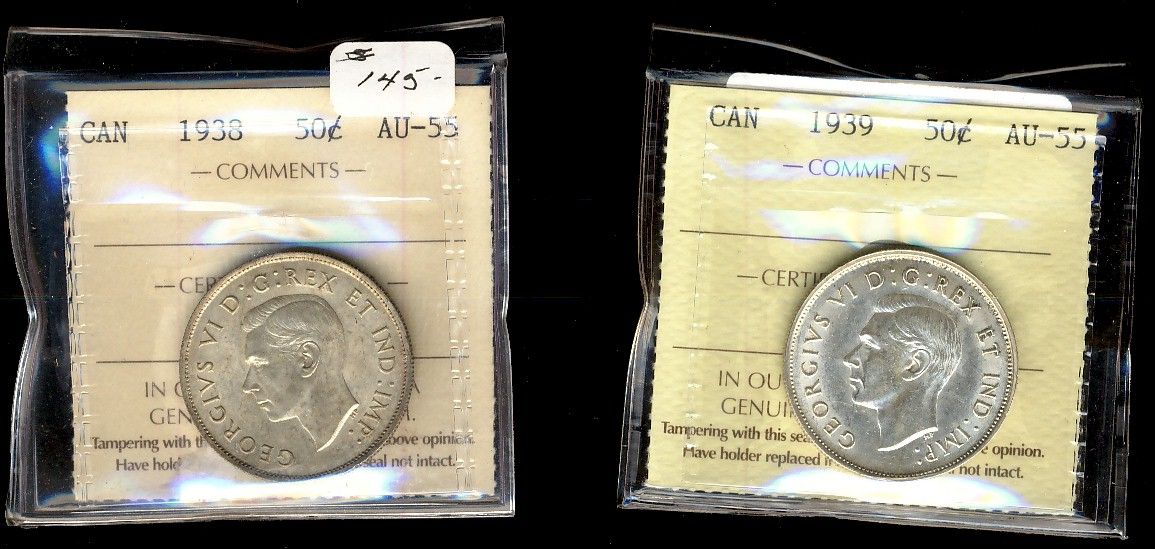 1938 50¢ & 1939 ICCS AU55. Lot of 2 coins.