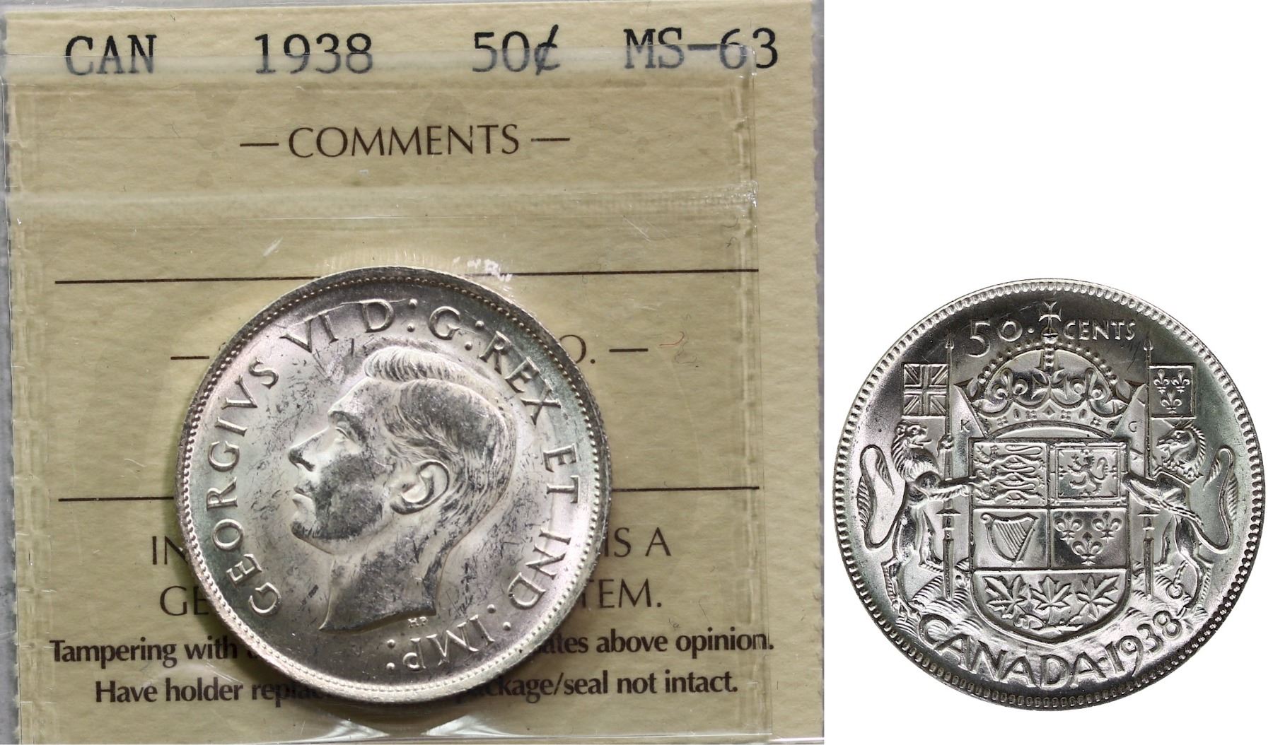 1938 50¢ ICCS Choice Mint State-63 Brilliant and lustrous.