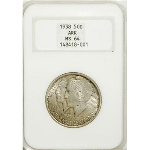 <B>1938 50C Arkansas MS64 NGC.</B></I> NGC Census: (196/156). PCGS Population (272/262). Mintage: 3,156. Numismedia Wsl. Price for NGC/PCGS coin in MS64: $154. (#9245)<BR><I>From The Frank DuVall Collection of U.S. Commemoratives.</B></I><BR><BR><b>Shipping:</b> Coins & Currency (<a target="_blank" href="http://www.heritageauctions.com/common/shipping.php">view shipping information</a>\)