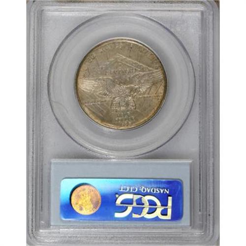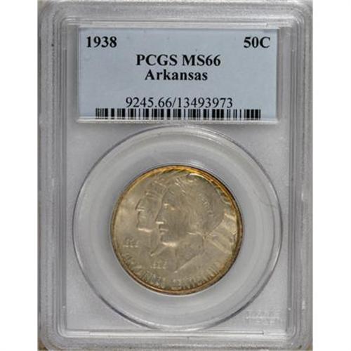 <B>1938 50C Arkansas MS66 PCGS.</B></I> By 1938, the distributors of the Arkansas halves were pandering to a collapsed market, and the net mintage for the Philadelphia issue amounted to just 3,156 pieces. This silver-gray Premium Gem has soft luster, pleasing detail, and a thin band of orange patina at the obverse and reverse rims. PCGS has certified just seven finer examples (7/07).<BR><BR><b>Shipping:</b> Coins & Currency (<a target="_blank" href="http://www.heritageauctions.com/common/shipping.php">view shipping information</a>)