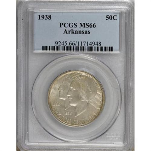 <B>1938 50C Arkansas MS66 PCGS.</B></I> The predominantly silver-gray surfaces of this Premium Gem have an undercurrent of orange that is readily apparent at the reverse periphery. A well-defined example of this Arkansas issue, which has a low mintage worthy of note. Population: 69 in 66, 7 finer (7/07).<BR><BR><b>Shipping:</b> Coins & Currency (<a target="_blank" href="http://www.heritageauctions.com/common/shipping.php">view shipping information</a>)