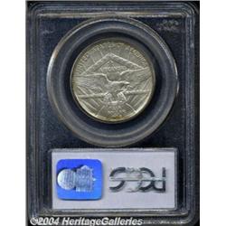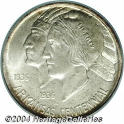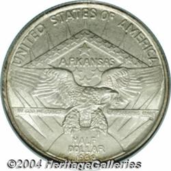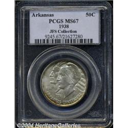 <B>1938<50C> Arkansas MS67 PCGS.</B></I> Condition Census, this silver-gray Superb Gem displays mottled olive and orange-gold overtones that are most vibrant in select peripheral areas. With no distracting abrasions, it is little wonder that this coin is among the finest certified 1938 Arkansas Commems. Population: 7 in 67, there are none finer (6/04).<BR><I>Ex: Charlotte ANA Signature Sale (Heritage, 3/03), lot 6844, which realized $6,612.50.</B></I><BR><I>From the JFS Collection, the #1 All-Time PCGS Registry Set.</B></I> <BR><BR><B>Important notice:</B> Heritage usually auctions material at the rate of 200-250 lots per hour. On some occasions eBay Live bid software or the Internet may not be able to keep up with the pace of the auction. We recommend placing a realistic absentee bid now as insurance to avoid disappointment. Occasionally the auctioneer may eliminate or reject an eBay Live bid, and the auctioneer may also reopen a lot after the close of the eBay live bidding (usually because we missed an audience bid), and may reject your bid even if it shows you as the winning bidder. By bidding via eBay Live, you agree that Heritage may award the lot to another bidder at its sole discretion under the circumstances described above or any other reasonable circumstances. Since eBay bids are not shown to us until we open the lot on the floor, we treat those bids just like floor bids. In most cases the floor responds before the eBay bid is presented to us, due to Internet lag time, so for consistency we have made it a policy that floor bids are always considered first over tie eBay live bids. Also please note that all Heritage lots purchased through eBay Live carry a 20% Buyer's Premium. Please make sure you read the Terms and Conditions before you bid. </span></font></tr></table></td></tr></table>