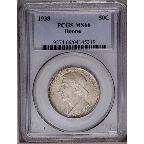 <B>1938<50C> Boone MS66 PCGS.</B></I> Milky gray and olive-gold patina lightly coats each side. An attractive Premium Gem, one of just 2,100 pieces struck of this final year of type. <BR><BR><B>Important notice:</B> Heritage usually auctions material at the rate of 200-250 lots per hour. On some occasions eBay Live bid software or the Internet may not be able to keep up with the pace of the auction. We recommend placing a realistic absentee bid now as insurance to avoid disappointment. Occasionally the auctioneer may eliminate or reject an eBay Live bid, and the auctioneer may also reopen a lot after the close of the eBay live bidding (usually because we missed an audience bid), and may reject your bid even if it shows you as the winning bidder. By bidding via eBay Live, you agree that Heritage may award the lot to another bidder at its sole discretion under the circumstances described above or any other reasonable circumstances. Since eBay bids are not shown to us until we open the lot on the floor, we treat those bids just like floor bids. In most cases the floor responds before the eBay bid is presented to us, due to Internet lag time, so for consistency we have made it a policy that floor bids are always considered first over tie eBay live bids. Also please note that all Heritage lots purchased through eBay Live carry a 20% Buyer's Premium. Please make sure you read the Terms and Conditions before you bid. This lot is being auctioned in conjunction with a live floor auction by Heritage Galleries & Auctioneers. All final auction and invoice information will be supplied by Heritage Galleries & Auctioneers, and all other information should be considered preliminary. Lot:4890 <BR><BR><B>Winning Notification and Billing:</B> After the FINAL session in this auction is complete, Heritage will send e-mail and snail mail invoices. This process normally takes several days. All final auction and invoice information will be supplied by Heritage Galleries & Auctioneers, and all other information should be considered preliminary. <BR><BR>This auction will be conducted on a live auction floor and over the Internet through eBay Live. If you choose to place an absentee bid, please take a moment to <font color='#0000ff'><u><a href='http://pages.ebay.com/liveauctions/help/before/laabsentee.html'>learn how eBay Live absentee bidding works</a></u></font><font color='#000000'>