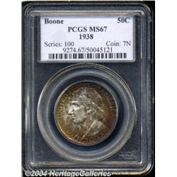 <table><tr><td><TABLE cellSpacing=0 cellPadding=0 width="100%" bgColor=#000000 border=0><TBODY> <TR><TD width="100%"><TABLE cellSpacing=1 cellPadding=3 width="100%" border=0><TBODY><TR><TD width="100%" bgColor=#79735c><FONT face=arial color=#ffffff size=3><B>Description</B> </FONT></TD></TR><TR><TD width="100%" bgColor=#ffffff><FONT face=arial size=2><B>1938 50C Boone MS67 PCGS.</B></I> This is a beautifully toned Superb Gem with silver-gray centers and dappled multicolored shadings over most of the coin. Rich reddish-russet, antique-golden, and lime-green hues are seen in varying quantities. Both sides are sharply struck and smooth. NGC and PCGS combined report only 14 examples in MS67, with only one finer (10/03). </FONT></TD></TR></TBODY></TABLE></TD></TR></TBODY></TABLE><BR><A name=PricesRealized></A><TABLE cellSpacing=0 cellPadding=0 width="100%" bgColor=#000000 border=0><TBODY><TR><TD width="100%"><TABLE cellSpacing=1 cellPadding=3 width="100%" border=0><TBODY><TR><TD width="100%" bgColor=#79735c><A name=PR><FONT face=arial color=#ffffff size=3><B>Previous Prices from Heritage Auctions</B> </FONT></A></TD></TR><TR><TD bgColor=#f6f6ed><TABLE cellSpacing=0 cellPadding=0 width="100%" border=1><TBODY><TR><TD align=middle width="33%"><B>Date</B></TD><TD align=middle width="33%"><B>Service</B></TD><TD align=middle width="33%"><B>Price</B></TD></TR><TR bgColor=whitesmoke><TD width="33%"><B>11/23/2002</B></TD><TD width="33%">PCGS</TD><TD width="33%">$3,450.00</TD></TR><TR bgColor=whitesmoke><TD width="33%"><B>08/07/1999</B></TD><TD width="33%">PCGS</TD><TD width="33%">$2,185.00</TD></TR></TBODY></TABLE></TD></TR><TR><TD bgColor=#ffffff><FONT face=arial size=1 ?>PLEASE NOTE: All prices realized reflect the final hammer price PLUS the buyer's premium in auctions that charge a buyer's premium. Each item has a notation at the top of the listing indicating whether that lot included a buyer's premium. Example: A item that sells with a final hammer price of $100 and a 20% buyer's premium will display with a price realized of $120. All information listed is intended to be as accurate as possible, but errors are possible. Please use this guide carefully and inform us of any inaccuracies. </FONT></TD></TR></TBODY></TABLE></TD></TR></TBODY></TABLE><BR><TABLE cellSpacing=0 cellPadding=0 width="100%" bgColor=#000000 border=0><TBODY><TR><TD width="100%"><TABLE cellSpacing=1 cellPadding=3 width="100%" border=0><TBODY><TR><TD width="100%" bgColor=#79735c colSpan=6><FONT face=arial color=#ffffff size=3><B>Price Guide*</B> </FONT></TD></TR><TR bgColor=#f6f6ed><TD align=middle><B>Grade</B> </TD><TD align=middle><B>Coin World<BR>(Trends)</B> </TD><TD align=middle><B>Numismedia<BR>Retail</B> </TD><TD align=middle><B>Numismedia<BR>Wholesale</B> </TD><TD align=middle><B>Coin<BR>Universe</B> </TD><TD align=middle><B>Heritage<BR>Value Index</B> </TD></TR><TR bgColor=#ffffff><TD align=middle>66</TD><TD align=right>---</TD><TD align=right>---</TD><TD align=right>$800.00</TD><TD align=right>$1,100.00</TD><TD align=right>$565.00</TD></TR><TR style="FONT-WEIGHT: bold" bgColor=#cccfdd><TD align=middle>67</TD><TD align=right>---</TD><TD align=right>---</TD><TD align=right>---</TD><TD align=right>$3,500.00</TD><TD align=right>$2,450.00</TD></TR><TR bgColor=#ffffff><TD align=middle>68</TD><TD align=right>---</TD><TD align=right>---</TD><TD align=right>---</TD><TD align=right>---</TD><TD align=right>---</TD></TR><TR bgColor=#ffffff><TD colSpan=6><FONT size=1>*All information listed is intended to be as accurate as possible, but errors are possible. No item may be returned or refused based on this information which is provided as a service to our customers. You should contact each pricing source directly to determine the accuracy of this information. </FONT></TD></TR></TBODY></TABLE></TD></TR></TBODY></TABLE><BR><TABLE cellSpacing=0 cellPadding=0 width="100%" bgColor=#000000 border=0><TBODY><TR><TD width="100%"><TABLE cellSpacing=1 cellPadding=3 width="100%" border=0><TBODY><TR><TD width="100%" bgColor=#79735c><FONT face=arial color=#ffffff size=3><B>Population Guide</B> </FONT></TD></TR><TR bgColor=#ffffff><TD align=middle><!-- Begin Output of Population Grid--><TABLE cellSpacing=0 cellPadding=0 width="100%" border=0><TBODY><TR><TD vAlign=center><TABLE cellSpacing=0 width="100%" border=1 cellsadding="3"><TBODY><TR><TD vAlign=center><TABLE cellSpacing=0 cellPadding=3 width="100%" border=1><TBODY><TR><TD vAlign=center align=middle bgColor=#f0f1e8 colSpan=2 <CENTER><FONT face=Arial size=2><B>PCGS Pop </B></FONT><CENTER></CENTER></TD><TD vAlign=center align=middle bgColor=#f0f1e8 colSpan=2><CENTER><FONT face=Arial size=2><B>NGC Pop</B></CENTER></FONT></TD></TR><TR><TD vAlign=center><FONT face=Arial size=2>(67)</FONT> </TD><TD vAlign=center align=right><FONT face=Arial size=2>11</FONT> </TD><TD vAlign=center><FONT face=Arial size=2>(67)</FONT> </TD><TD vAlign=center align=right><FONT face=Arial size=2>5</FONT> </TD></TR><TR><TD vAlign=center><FONT face=Arial size=2>(>67)</FONT> </TD><TD vAlign=center align=right><FONT face=Arial size=2>1</FONT> </TD><TD vAlign=center><FONT face=Arial size=2>(>67)</FONT> </TD><TD vAlign=center align=right><FONT face=Arial size=2>0</FONT> </TD></TR></TBODY></TABLE></TD></TR></TBODY></TABLE></TD></TR></TBODY></TABLE><!-- End Output of Population Grid--></TD></TR></TBODY></TABLE></TD></TR></TBODY></TABLE><BR><TABLE cellSpacing=0 cellPadding=0 width="100%" bgColor=#000000 border=0><TBODY><TR> <font color='#000000'><span style='background-color: #FFFFFF'><td bgcolor='#FFFFFE'> Important notice: Heritage usually auctions material at the rate of 200-250 lots per hour. On some occasions eBay Live bid software or the Internet may not be able to keep up with the pace of the auction. We recommend placing a realistic absentee bid now as insurance to avoid disappointment. Occasionally the auctioneer may eliminate or reject an eBay Live bid, and the auctioneer may also reopen a lot after the close of the eBay 