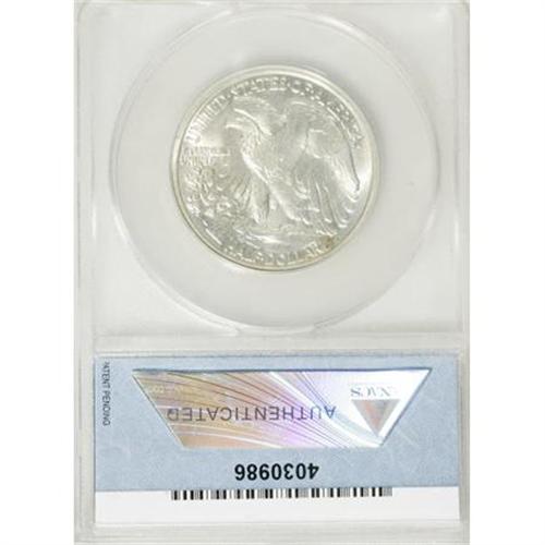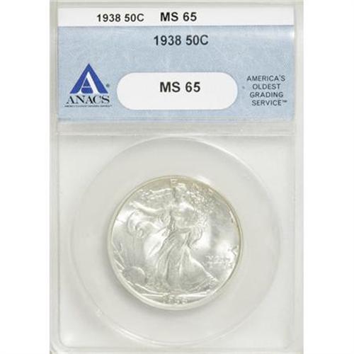 <B>1938 50C MS65 ANACS.</B></I> NGC Census: (688/259). PCGS Population (999/495). Mintage: 4,118,152. Numismedia Wsl. Price for NGC/PCGS coin in MS65: $400. (#6604)<BR><BR><B>Coin Engraver:</B> Adolph A. Weinman<BR><BR><b>Shipping:</b> Coins & Currency (<a target="_blank" href="http://www.heritageauctions.com/common/shipping.php">view shipping information</a>)