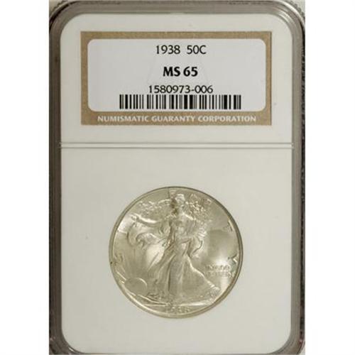 <B>1938 50C MS65 NGC.</B></I> NGC Census: (681/256). PCGS Population (985/478). Mintage: 4,118,152. Numismedia Wsl. Price for NGC/PCGS coin in MS65: $400. (#6604)<BR><BR><B>Coin Engraver:</B> Adolph A. Weinman<BR><BR><b>Shipping:</b> Coins & Currency (<a target="_blank" href="http://www.heritageauctions.com/common/shipping.php">view shipping information</a>)