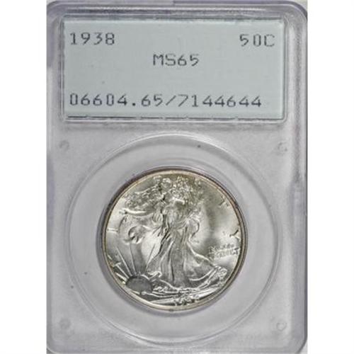 <B>1938 50C MS65 PCGS.</B></I> Olive-gold tints adorn this lustrous and crisply impressed Gem. Though this issue was saved in quantity, well-preserved examples remain popular with date and type collectors alike. Housed in a first-generation PCGS holder.<BR><BR><B>Coin Engraver:</B> Adolph A. Weinman<BR><BR><b>Shipping:</b> Coins & Currency (<a target="_blank" href="http://www.heritageauctions.com/common/shipping.php">view shipping information</a>)