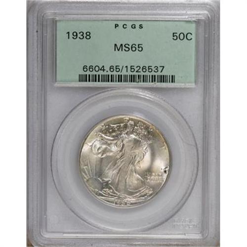 <B>1938 50C MS65 PCGS.</B></I> PCGS Population (985/480). NGC Census: (681/256). Mintage: 4,118,152. Numismedia Wsl. Price for NGC/PCGS coin in MS65: $452. (#6604)<BR><BR><B>Coin Engraver:</B> Adolph A. Weinman<BR><BR><b>Shipping:</b> Coins & Currency (<a target="_blank" href="http://www.heritageauctions.com/common/shipping.php">view shipping information</a>\)