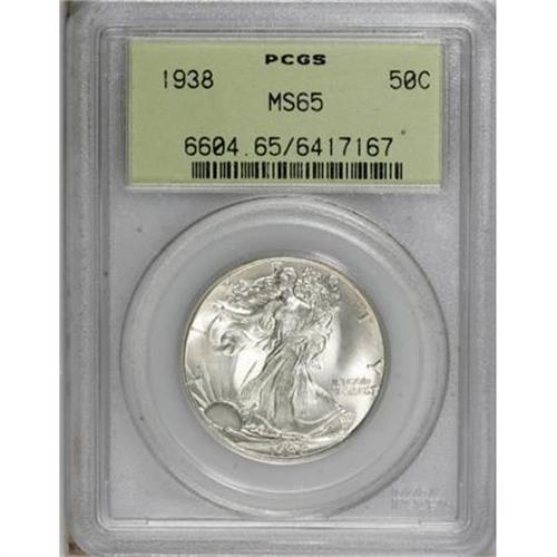 <B>1938 50C MS65 PCGS.</B></I> PCGS Population (985/478). NGC Census: (681/256). Mintage: 4,118,152. Numismedia Wsl. Price for NGC/PCGS coin in MS65: $400. (#6604)<BR><BR><B>Coin Engraver:</B> Adolph A. Weinman<BR><BR><b>Shipping:</b> Coins & Currency (<a target="_blank" href="http://www.heritageauctions.com/common/shipping.php">view shipping information</a>)