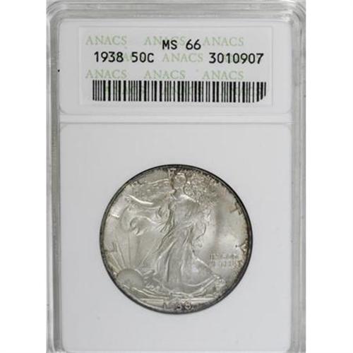 <B>1938 50C MS66 ANACS.</B></I> NGC Census: (234/22). PCGS Population (445/50). Mintage: 4,118,152. Numismedia Wsl. Price for NGC/PCGS coin in MS66: $725. (#6604)<BR><BR><B>Coin Engraver:</B> Adolph A. Weinman<BR><BR><b>Shipping:</b> Coins & Currency (<a target="_blank" href="http://www.heritageauctions.com/common/shipping.php">view shipping information</a>)