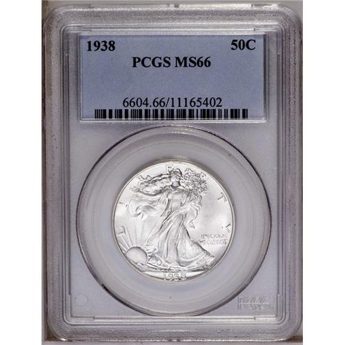 <B>1938<50C> MS66 PCGS.</B></I> White, exceptionally well struck, and nearly unimprovable with only the faintest luster grazes preventing the Superb Gem level. <BR><BR><B>Important notice:</B> Heritage usually auctions material at the rate of 200-250 lots per hour. On some occasions eBay Live bid software or the Internet may not be able to keep up with the pace of the auction. We recommend placing a realistic absentee bid now as insurance to avoid disappointment. Occasionally the auctioneer may eliminate or reject an eBay Live bid, and the auctioneer may also reopen a lot after the close of the eBay live bidding (usually because we missed an audience bid), and may reject your bid even if it shows you as the winning bidder. By bidding via eBay Live, you agree that Heritage may award the lot to another bidder at its sole discretion under the circumstances described above or any other reasonable circumstances. Since eBay bids are not shown to us until we open the lot on the floor, we treat those bids just like floor bids. In most cases the floor responds before the eBay bid is presented to us, due to Internet lag time, so for consistency we have made it a policy that floor bids are always considered first over tie eBay live bids. Also please note that all Heritage lots purchased through eBay Live carry a 20% Buyer's Premium. Please make sure you read the Terms and Conditions before you bid. This lot is being auctioned in conjunction with a live floor auction by Heritage Galleries & Auctioneers. All final auction and invoice information will be supplied by Heritage Galleries & Auctioneers, and all other information should be considered preliminary. Lot:2971 <BR><BR><B>Winning Notification and Billing:</B> After the FINAL session in this auction is complete, Heritage will send e-mail and snail mail invoices. This process normally takes several days. All final auction and invoice information will be supplied by Heritage Galleries & Auctioneers, and all other information should be considered preliminary. <BR><BR>This auction will be conducted on a live auction floor and over the Internet through eBay Live. If you choose to place an absentee bid, please take a moment to <font color='#0000ff'><u><a href='http://pages.ebay.com/liveauctions/help/before/laabsentee.html'>learn how eBay Live absentee bidding works</a></u></font><font color='#000000'>
