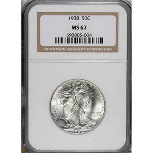 <B>1938 50C MS67 NGC.</B></I> Shimmering luster adorns both sides of this untoned Superb Gem Walker, and a solid strike emboldens the design elements, including excellent definition in Liberty's gown lines, head, hand, and associated branches. Both faces are virtually pristine. Available through MS65, but quite elusive any finer. Census: 22 in 67, 0 finer (6/07).<BR><BR><b>Shipping:</b> Coins & Currency (<a target="_blank" href="http://www.heritageauctions.com/common/shipping.php">view shipping information</a>)