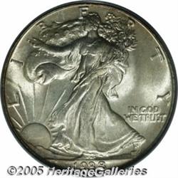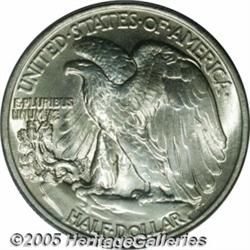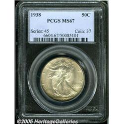 <B>1938 50C MS67 PCGS.</B></I> Both sides are draped in golden-gray patina that deepens somewhat about the obverse border. Well struck with a couple of small contact marks on the eagle's right (facing) leg. A scarce P-mint Walker in this outstanding grade. Population: 36 in 67, 0 finer (2/05).