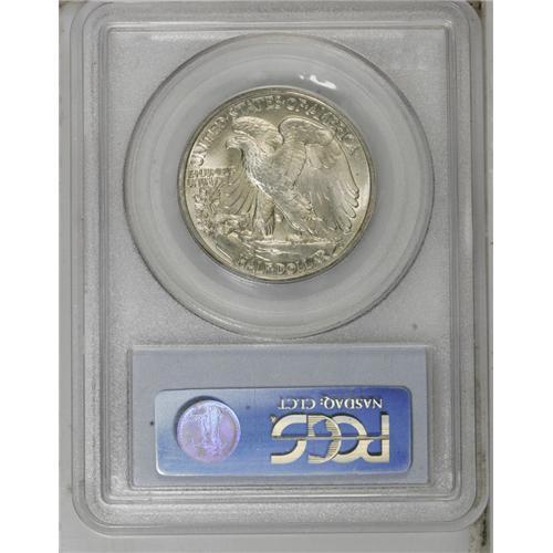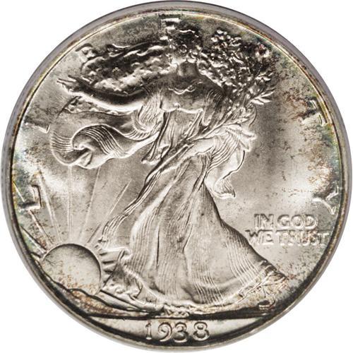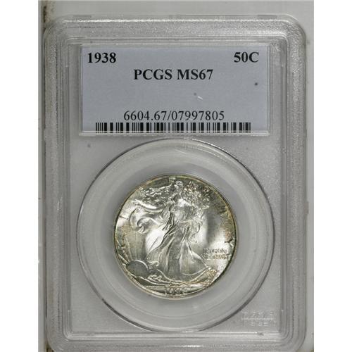 <B>1938 50C MS67 PCGS.</B></I> Speckles of orange-gold and cobalt-blue toning gravitate to the margins of this intensely lustrous Superb Gem, being more extensive and deeper in hue on the obverse. A well executed strike manifests itself in sharp definition on Liberty's head, left hand, and gown lines. There are no significant abrasions to report. A couple of tiny toning spots on the right reverse are mentioned for accuracy. Population: 46 in 67, 0 finer (11/06).<BR><BR><b>Shipping:</b> Coin/Currency (<a target="_blank" href="http://www.heritageauctions.com/common/shipping.php">view shipping information</a>)