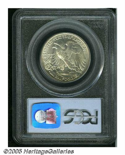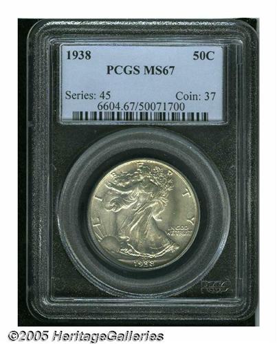 <B>1938<50C> MS67 PCGS.</B></I> This is a favorite date among collectors, in part because of the elusive nature of its Denver Mint counterpart. Quite a few have been graded, but neither service has seen a finer example. Bruce Fox called this a better date that is underrated in fully struck Gem quality. This example is quite well struck, and nearly qualifies as one of the underrated full strikes. The surfaces are lustrous and brilliant with the faintest heather toning. Population: 40 in 67, 0 finer (6/05).<BR><I>From The Robert Moreno Collection.</B></I>
