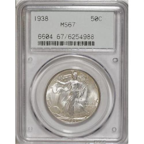 <B>1938 50C MS67 PCGS.</B></I> This meticulously struck Superb Gem exhibits delicate olive-green and ice-blue patina. Those in search of contact marks will find their efforts in vain. Exceptional quality for this lower mintage issue. Encased in an old green label holder. Population: 50 in 67, 0 finer (11/07).<BR><BR><B>Coin Engraver:</B> Adolph A. Weinman<BR><BR><b>Shipping:</b> Coins & Currency (<a target="_blank" href="http://www.heritageauctions.com/common/shipping.php">view shipping information</a>)