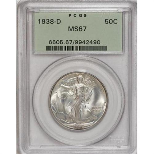 <B>1938 50C MS67 PCGS.</B></I> The design details are crisply rendered, and the satiny surfaces only exhibit hints of toning near the periphery. The striking sharpness is actually remarkable, as Liberty's head and branch hand are essentially fully defined. Impressive surface preservation is also noted, as any distracting marks or luster grazes are nonexistent. Population: 50 in 67, 0 finer (12/07). <BR><BR><B>Coin Engraver:</B> Adolph A. Weinman<BR><BR><b>Shipping:</b> Coins & Currency (<a target="_blank" href="http://www.heritageauctions.com/common/shipping.php">view shipping information</a>)