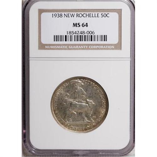 <B>1938 50C New Rochelle MS64 NGC.</B></I> NGC Census: (438/1415). PCGS Population (1176/2229). Mintage: 15,266. Numismedia Wsl. Price for NGC/PCGS coin in MS64: $380. (#9335)<BR><I>From The Frank DuVall Collection of U.S. Commemoratives.</B></I><BR><BR><b>Shipping:</b> Coins & Currency (<a target="_blank" href="http://www.heritageauctions.com/common/shipping.php">view shipping information</a>\)