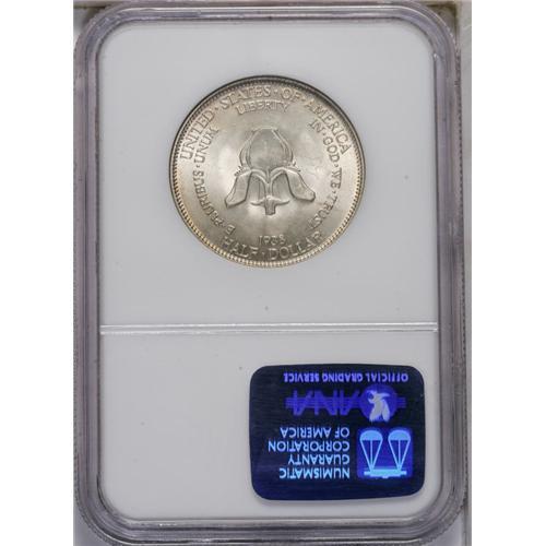 <B>1938<50C> New Rochelle MS65 NGC.</B></I> A thin veil of silver-gold patina blankets each side and deepens slightly at the borders. A couple of minor field marks on the reverse are also noted.