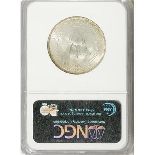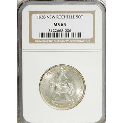 <B>1938 50C New Rochelle MS65 NGC.</B></I> . NGC Census: (896/559). PCGS Population (1391/890). Mintage: 15,266. Numismedia Wsl. Price for NGC/PCGS coin in MS65: $480. (#9335)<BR><BR><b>Shipping:</b> Coins & Currency (<a target="_blank" href="http://www.heritageauctions.com/common/shipping.php">view shipping information</a>)