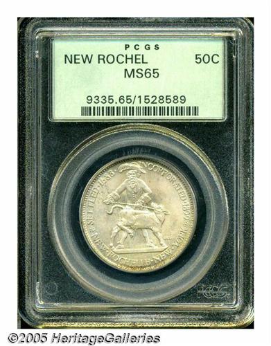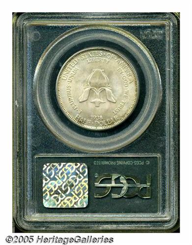 <B>1938<50C> New Rochelle MS65 PCGS.</B></I> Well struck with lovely pastel coloration on both sides, supplemented by a small degree of speckled patina near the borders. Gleaming satiny luster radiates from both sides, and there are only a few small imperfections, as expected for a Gem.
