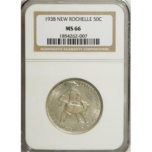 <B>1938 50C New Rochelle MS66 NGC.</B></I> NGC Census: (451/89). PCGS Population (729/134). Mintage: 15,266. Numismedia Wsl. Price for NGC/PCGS coin in MS66: $650. (#9335)<BR><I>From The Frank DuVall Collection of U.S. Commemoratives.</B></I><BR><BR><b>Shipping:</b> Coins & Currency (<a target="_blank" href="http://www.heritageauctions.com/common/shipping.php">view shipping information</a>\)