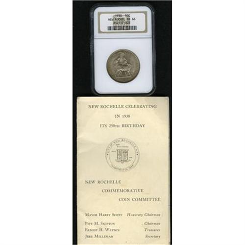 <B>1938 50C New Rochelle MS66 NGC.</B></I> Included with this lot is it's original New Rochelle five coin holder. NGC Census: (453/92). PCGS Population (738/139). Mintage: 15,266. Numismedia Wsl. Price for NGC/PCGS coin in MS66: $650. (#9335)<BR><BR><b>Shipping:</b> Coins & Currency (<a target="_blank" href="http://www.heritageauctions.com/common/shipping.php">view shipping information</a>)