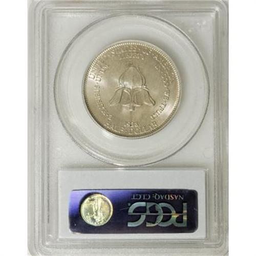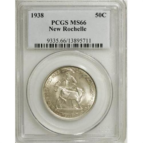 <B>1938 50C New Rochelle MS66 PCGS.</B></I> PCGS Population (729/134). NGC Census: (451/89). Mintage: 15,266. Numismedia Wsl. Price for NGC/PCGS coin in MS66: $650. (#9335)<BR><I>From The Frank DuVall Collection of U.S. Commemoratives.</B></I><BR><BR><b>Shipping:</b> Coins & Currency (<a target="_blank" href="http://www.heritageauctions.com/common/shipping.php">view shipping information</a>)
