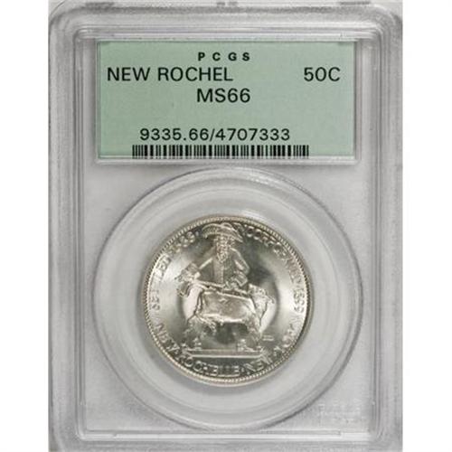 <B>1938 50C New Rochelle MS66 PCGS.</B></I> PCGS Population (744/140). NGC Census: (457/92). Mintage: 15,266. Numismedia Wsl. Price for NGC/PCGS coin in MS66: $650. (#9335)<BR><BR><b>Shipping:</b> Coins & Currency (<a target="_blank" href="http://www.heritageauctions.com/common/shipping.php">view shipping information</a>)