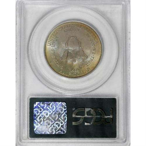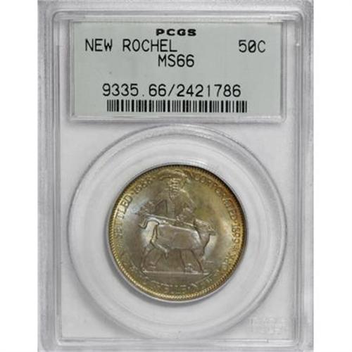 <B>1938 50C New Rochelle MS66 PCGS.</B></I> Rich gold-orange, olive, violet, and powder-blue toning drapes each side of this shining and pleasingly detailed New Rochelle half. Excellent preservation and striking visual appeal.<BR><BR><b>Shipping:</b> Coins & Currency (<a target="_blank" href="http://www.heritageauctions.com/common/shipping.php">view shipping information</a>)