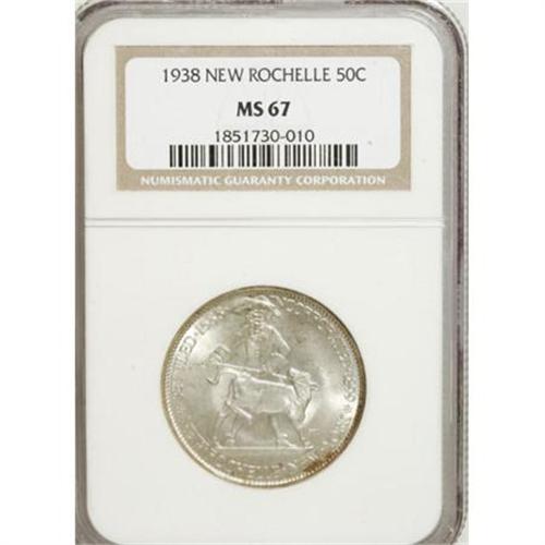 <B>1938 50C New Rochelle MS67 NGC.</B></I> Delicate peach-pink and rose accents grace the luminous surfaces of this carefully preserved New Rochelle half. Solidly struck and an attractive example of this local-interest issue. NGC has graded just 15 numerically superior pieces (10/07).<BR><BR><b>Shipping:</b> Coins & Currency (<a target="_blank" href="http://www.heritageauctions.com/common/shipping.php">view shipping information</a>)
