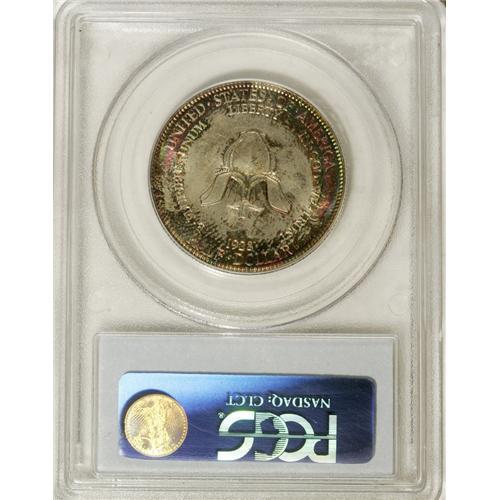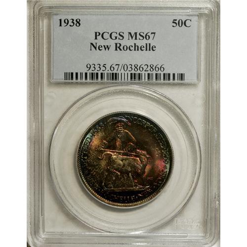 <B>1938 50C New Rochelle MS67 PCGS.</B></I> The jewel-toned obverse exhibits widespread amber, citrine, ruby, emerald, and sapphire patina, while those colors appear only at the margins at the reverse. A highly lustrous and exquisitely preserved example of this late-date local-celebration issue. PCGS has certified only two coins finer (4/07).<BR><I>From The Cary & Cheryl Porter Collection.</B></I><BR><BR><b>Shipping:</b> Coins & Currency (<a target="_blank" href="http://www.heritageauctions.com/common/shipping.php">view shipping information</a>)