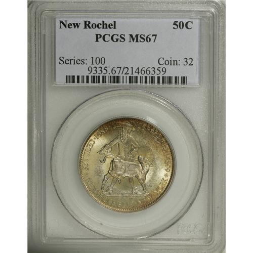 <B>1938 50C New Rochelle MS67 PCGS.</B></I> The reverse is dramatically tab toned in deep lilac, sea-green, orange-gold, and crimson. The obverse possesses a lovely mix of yellow-gold, burnt-orange, and olive patina. PCGS has only certified two pieces finer (1/07).<BR><BR><b>Shipping:</b> Coins & Currency (<a target="_blank" href="http://www.heritageauctions.com/common/shipping.php">view shipping information</a>)