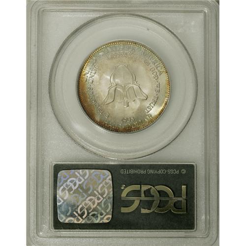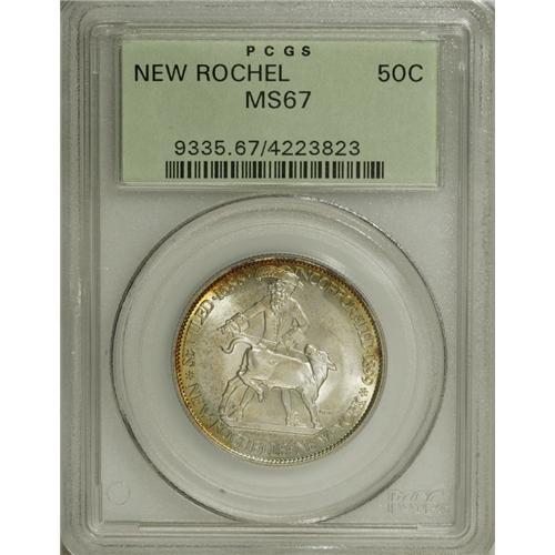 <B>1938 50C New Rochelle MS67 PCGS.</B></I> This highly lustrous piece sports above-average detail and vibrant orange peripheral toning around silver-gray centers. A handful of grazes are noted on the reverse. PCGS has certified only two coins finer (1/07).<BR><BR><b>Shipping:</b> Coins & Currency (<a target="_blank" href="http://www.heritageauctions.com/common/shipping.php">view shipping information</a>)