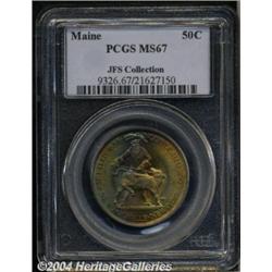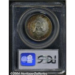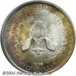 <B>1938<50C> New Rochelle MS67 PCGS.</B></I> Absolutely splendid rainbow iridescence blankets the obverse of this well struck, dynamically lustrous Superb Gem. The reverse shows similar coloration close to the peripheries, with flashy brilliance near the centers. There are a few wispy contact marks on each side, but most are quite well hidden by the deep toning. None have been graded any higher, by PCGS. Population: 15 in 67, 0 finer (3/04).<BR><I>From the JFS Collection, the #1 All-Time PCGS Registry Set.</B></I> <BR><BR><B>Important notice:</B> Heritage usually auctions material at the rate of 200-250 lots per hour. On some occasions eBay Live bid software or the Internet may not be able to keep up with the pace of the auction. We recommend placing a realistic absentee bid now as insurance to avoid disappointment. Occasionally the auctioneer may eliminate or reject an eBay Live bid, and the auctioneer may also reopen a lot after the close of the eBay live bidding (usually because we missed an audience bid), and may reject your bid even if it shows you as the winning bidder. By bidding via eBay Live, you agree that Heritage may award the lot to another bidder at its sole discretion under the circumstances described above or any other reasonable circumstances. Since eBay bids are not shown to us until we open the lot on the floor, we treat those bids just like floor bids. In most cases the floor responds before the eBay bid is presented to us, due to Internet lag time, so for consistency we have made it a policy that floor bids are always considered first over tie eBay live bids. Also please note that all Heritage lots purchased through eBay Live carry a 20% Buyer's Premium. Please make sure you read the Terms and Conditions before you bid. </span></font></tr></table></td></tr></table>