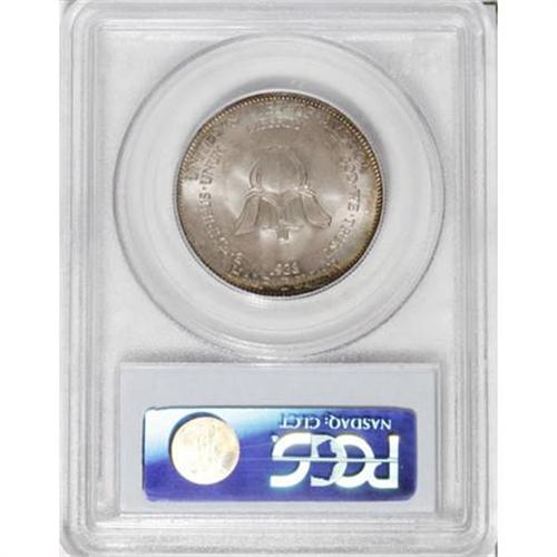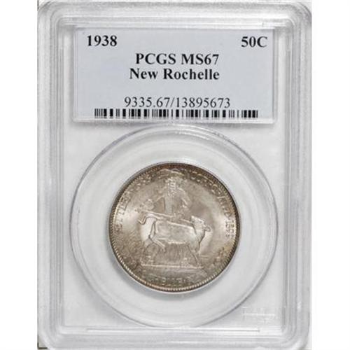 <B>1938 50C New Rochelle MS67 PCGS.</B></I> This is a truly gorgeous Superb Gem representative of the attractively designed New Rochelle commemorative. Deep charcoal-gray coloration in the fields yields to lovely gold and sea-green peripheral iridescence on both sides. Sharply struck, highly lustrous, and pristine. Included with the lot is an original one slot holder. <BR><I>From The Frank DuVall Collection of U.S. Commemoratives.</B></I><BR><BR><b>Shipping:</b> Coins & Currency (<a target="_blank" href="http://www.heritageauctions.com/common/shipping.php">view shipping information</a>)