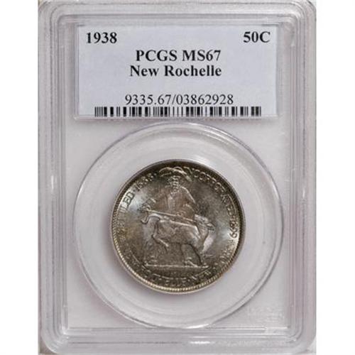 <B>1938 50C New Rochelle MS67 PCGS.</B></I> Magnificent blue-green and orange-gold alternate across this lustrous example. A hint of a fingerprint beneath UNUM will be missed by most observers.<BR><I>From The Cary & Cheryl Porter Collection, Part Three.</B></I><BR><BR><b>Shipping:</b> Coins & Currency (<a target="_blank" href="http://www.heritageauctions.com/common/shipping.php">view shipping information</a>)