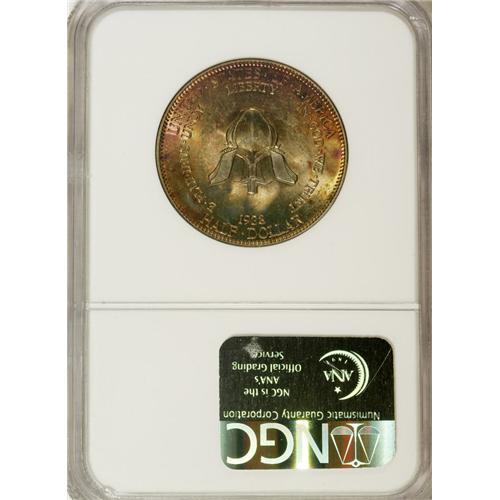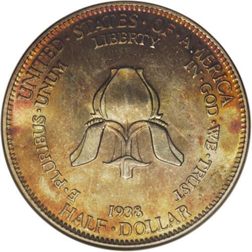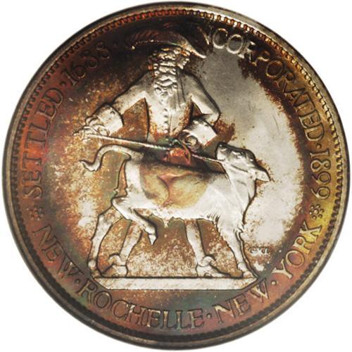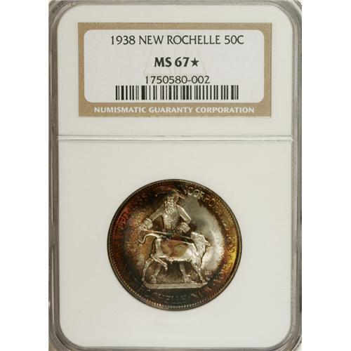 <B>1938 50C New Rochelle MS67 <img border='0' src='http://www.heritagecoins.com/images/star.gif' width=10 height=10> NGC.</B></I> Gertrude K. Lathrop, designer of the New Rochelle half, studied under famed sculptor and fellow commemorative half designer Gutzon Borglum in 1918 and received more intensive training in 1920 and 1921. The design that appears on this stellar Superb Gem reflects Lathrop's combination of instruction, talent, and more than a decade of practice. Cherry-red, plum, and gold-orange patina graces much of the obverse in a partial tab pattern, while the reverse has orange and peach colors with a trace of emerald patina. The vibrant luster that appears beneath the toning is even brighter at the brilliant areas on the obverse.<BR><I>From The Cary & Cheryl Porter Collection.</B></I><BR><BR><b>Shipping:</b> Coins & Currency (<a target="_blank" href="http://www.heritageauctions.com/common/shipping.php">view shipping information</a>)