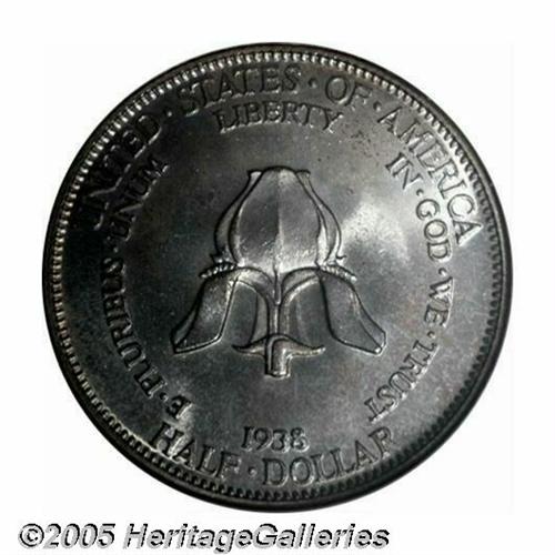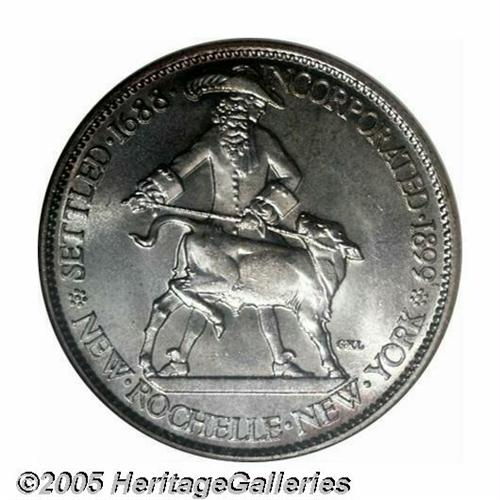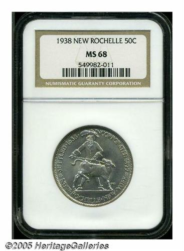 <B>1938<50C> New Rochelle MS68 NGC.</B></I> In addition to the design's characteristic radiance, near-flawless surfaces are untoned except for flashes of golden-rose patina at the margins. One of two New York types that were designed by Gertrude K. Lathrop, the other being the Albany commemorative. Population: 12 in 68, 0 finer (5/05).