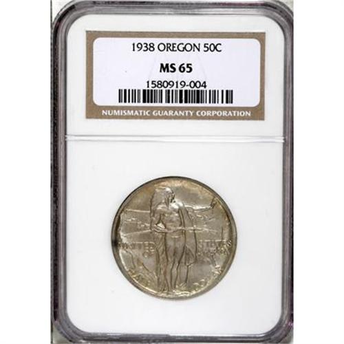 <B>1938 50C Oregon MS65 NGC.</B></I> NGC Census: (373/480). PCGS Population (644/421). Mintage: 6,006. Numismedia Wsl. Price for NGC/PCGS coin in MS65: $264. (#9348)<BR><BR><b>Shipping:</b> Coins & Currency (<a target="_blank" href="http://www.heritageauctions.com/common/shipping.php">view shipping information</a>\)