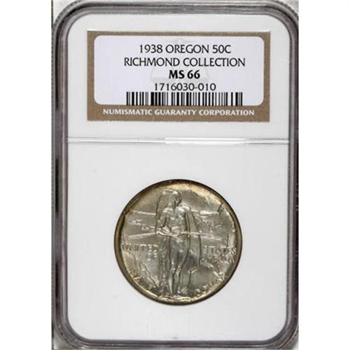 <B>1938 50C Oregon MS66 NGC.</B></I> Ex: Richmond Collection. NGC Census: (384/96). PCGS Population (365/56). Mintage: 6,006. Numismedia Wsl. Price for NGC/PCGS coin in MS66: $356. (#9348)<BR><BR><b>Shipping:</b> Coins & Currency (<a target="_blank" href="http://www.heritageauctions.com/common/shipping.php">view shipping information</a>\)