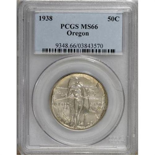 <B>1938 50C Oregon MS66 PCGS.</B></I> PCGS Population (363/55). NGC Census: (383/96). Mintage: 6,006. Numismedia Wsl. Price for NGC/PCGS coin in MS66: $356. (#9348)<BR><BR><b>Shipping:</b> Coins & Currency (<a target="_blank" href="http://www.heritageauctions.com/common/shipping.php">view shipping information</a>\)