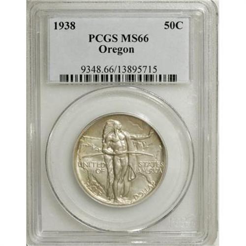 <B>1938 50C Oregon MS66 PCGS.</B></I> PCGS Population (363/55). NGC Census: (383/96). Mintage: 6,006. Numismedia Wsl. Price for NGC/PCGS coin in MS66: $356. (#9348)<BR><I>From The Frank DuVall Collection of U.S. Commemoratives.</B></I><BR><BR><b>Shipping:</b> Coins & Currency (<a target="_blank" href="http://www.heritageauctions.com/common/shipping.php">view shipping information</a>\)