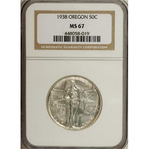 <B>1938 50C Oregon MS67 NGC.</B></I> Crisply struck and minimally toned with just a touch of ice-blue at the margins. This Superb Gem Oregon piece comes from an issue of only 6,006 pieces. NGC has graded just four numerically finer representatives (8/07).<BR><BR><b>Shipping:</b> Coins & Currency (<a target="_blank" href="http://www.heritageauctions.com/common/shipping.php">view shipping information</a>)
