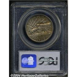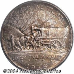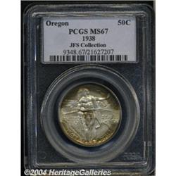 <B>1938<50C> Oregon MS67 PCGS.</B></I> This lovely Superb Gem clearly spent several decades undisturbed within its holder of issue, since the obverse borders offer deep orange-gold and apple-green colors while steel-gray color is otherwise in force aside from a dab of patina in the very center. The reverse is also impressively toned with streaks of apricot and lime-green color. A beautifully preserved and nicely struck example. The obverse is multiply die doubled, a feature best observed on the letters in HALF. Population: 51 in 67, 1 finer (6/04).<BR><I>Ex: FUN Signature Sale (Heritage, 1/02), as part of lot 8839, which realized $3,450.</B></I><BR><I>From the JFS Collection, the #1 All-Time PCGS Registry Set.</B></I> <BR><BR><B>Important notice:</B> Heritage usually auctions material at the rate of 200-250 lots per hour. On some occasions eBay Live bid software or the Internet may not be able to keep up with the pace of the auction. We recommend placing a realistic absentee bid now as insurance to avoid disappointment. Occasionally the auctioneer may eliminate or reject an eBay Live bid, and the auctioneer may also reopen a lot after the close of the eBay live bidding (usually because we missed an audience bid), and may reject your bid even if it shows you as the winning bidder. By bidding via eBay Live, you agree that Heritage may award the lot to another bidder at its sole discretion under the circumstances described above or any other reasonable circumstances. Since eBay bids are not shown to us until we open the lot on the floor, we treat those bids just like floor bids. In most cases the floor responds before the eBay bid is presented to us, due to Internet lag time, so for consistency we have made it a policy that floor bids are always considered first over tie eBay live bids. Also please note that all Heritage lots purchased through eBay Live carry a 20% Buyer's Premium. Please make sure you read the Terms and Conditions before you bid. </span></font></tr></table></td></tr></table>