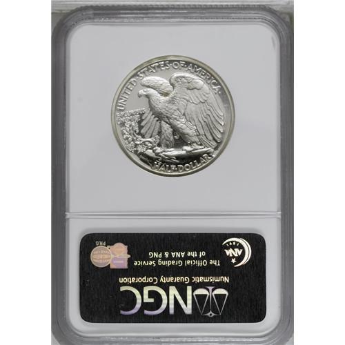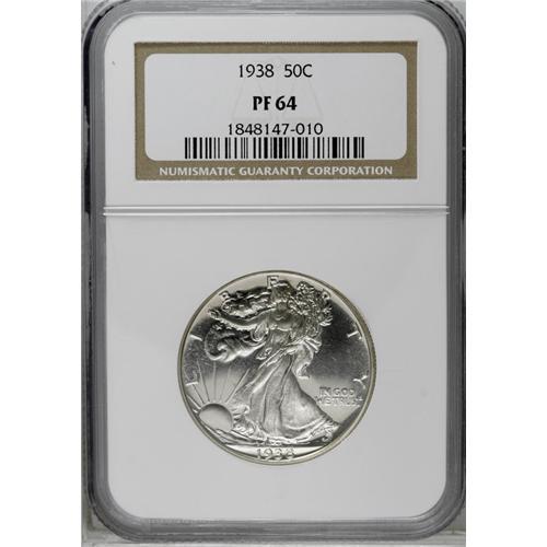 <B>1938<50C> PR64 NGC.</B></I> This bright near-Gem proof exudes nearly full brilliance, save for a wisp or two of gold-tan color on each side. The design elements reveal the expected bold definition. Limited in grade by a few unobtrusive hairlines in the right obverse field.