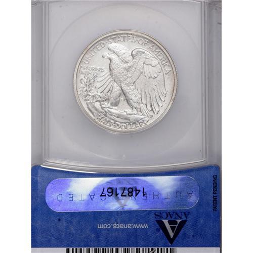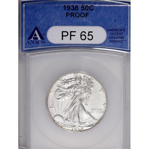 <B>1938<50C> PR65 ANACS.</B></I> A pleasing cream-gray Gem that lacks absolute detail on the branch hand, although all other design elements are needle-sharp. The 1938 is encountered much less often than the proof Walkers from the early 1940s.